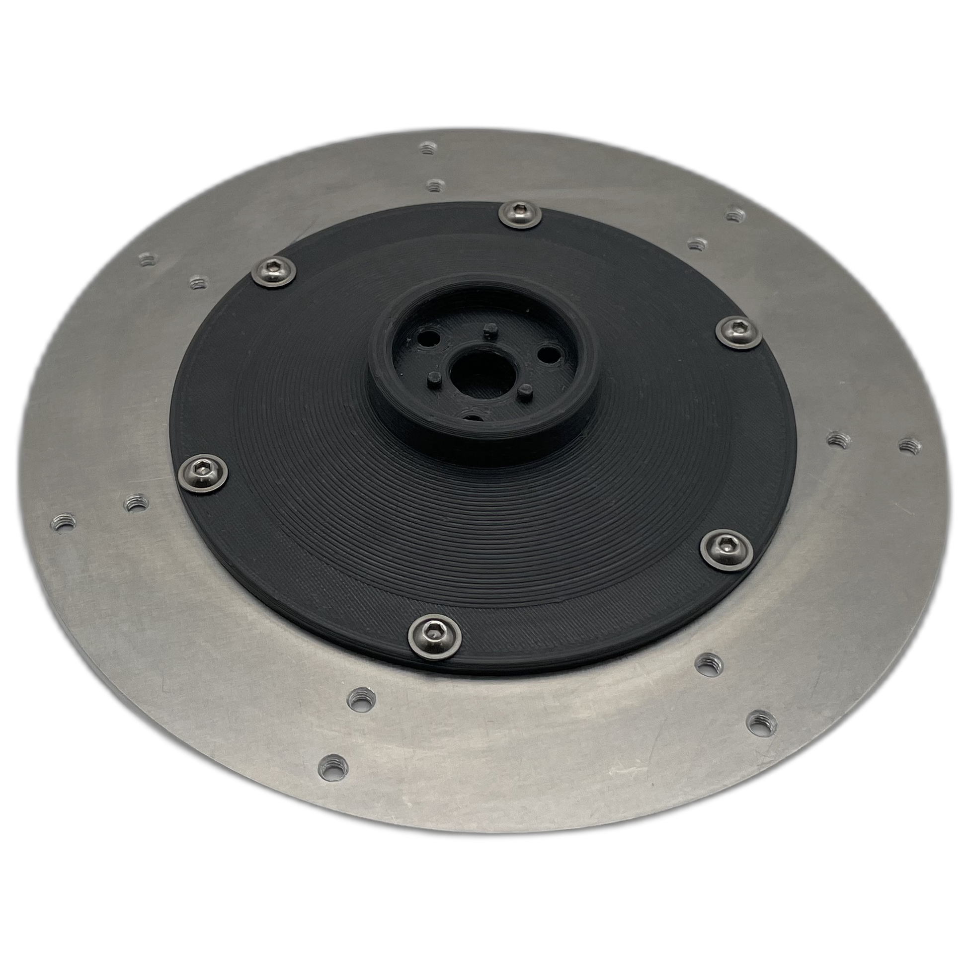 Der Flansch wurde aus stabilem PETG-Material 3D-gedruckt und anschließend mit der Drehmaschine präzise bearbeitet, um einen optimalen Rundlauf zu gewährleisten. Die Messerscheibe selbst besteht aus 3 mm starkem, hochfestem Aluminium, was eine langlebige und zuverlässige Leistung garantiert.